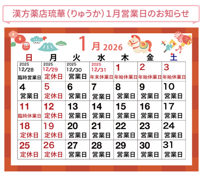 1月の定休日のお知らせです 2025年12月28日 NEW ! テーマ:お知らせ 1月の営業日・定休日のお知らせはこちらです。 ご相談はご予約制です。 LINEまたはお電話(098-987-0160)にてご予約の上ご来店ください。 どうぞよろしくお願いいたします!