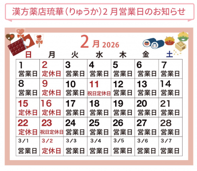 2月の定休日のお知らせです 2026年1月30日 NEW ! テーマ:お知らせ 2月の営業日・定休日のお知らせはこちらです。 ご相談はご予約制です。 LINEまたはお電話(098-987-0160)にてご予約の上ご来店ください。 どうぞよろしくお願いいたします!